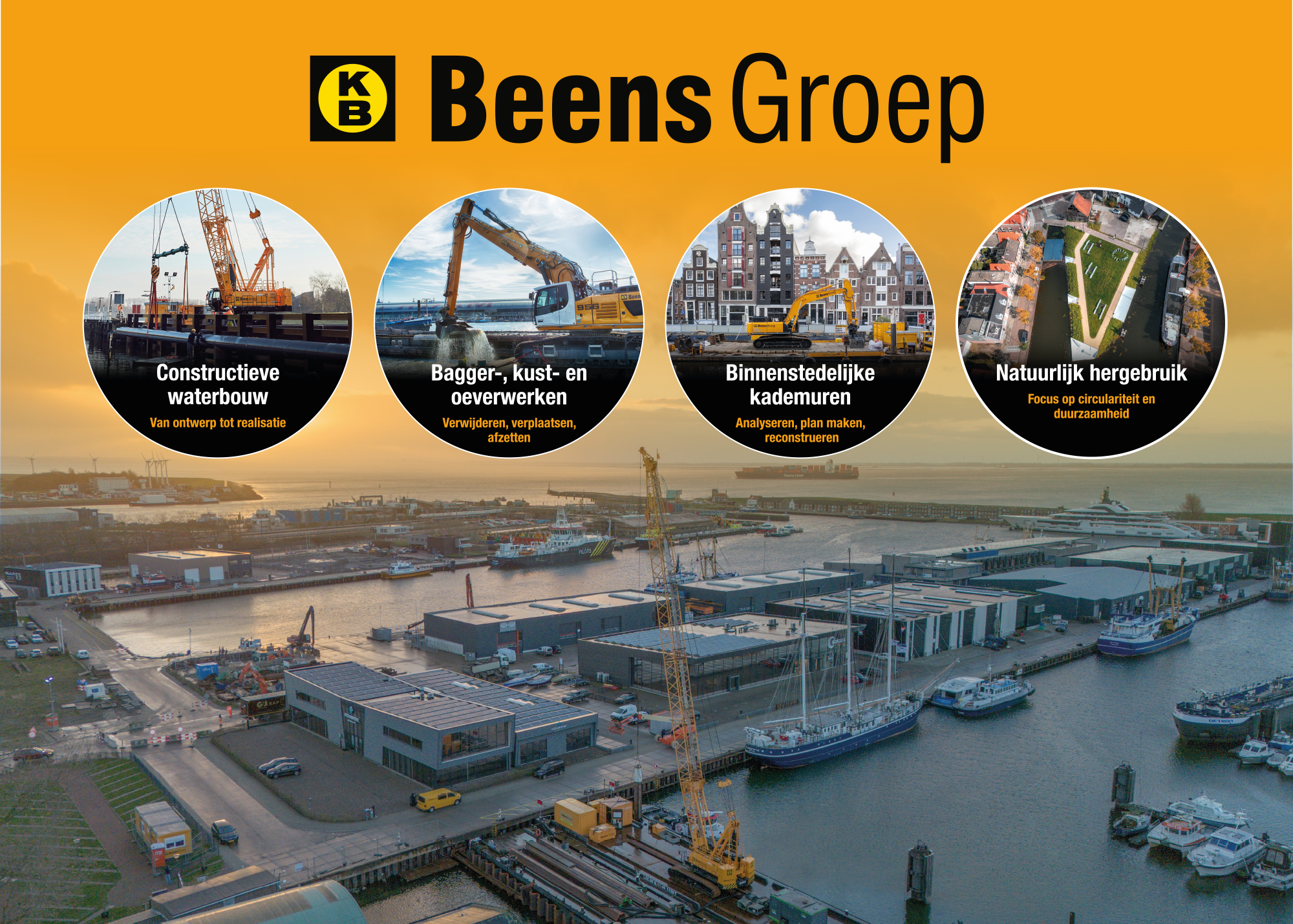 Beens Groep is specialist in constructieve waterbouw, baggerwerk en binnenstedelijke kademuren. Dit bedrijf werkt al meer dan 60 jaar lang op de grens van land en water. Meewerken aan betere vaarwegen en mens en achterland beschermen tegen het water, dat is wat Beens drijft. Omdat ze daar alle expertise en materieel voor in huis hebben, kunnen ze oplossingen voor waterbouwkundige constructies en baggerwerken ontwikkelen, organiseren en realiseren. Zo dragen ze bij aan het veilig, leefbaar en bereikbaar houden van Nederland.